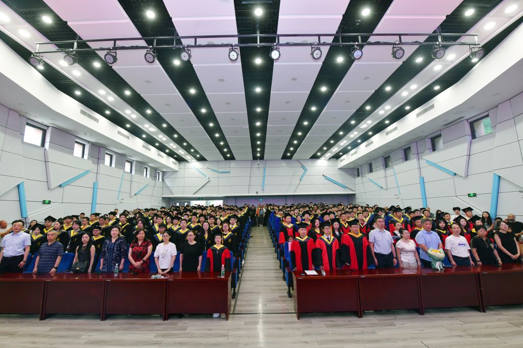 学院领导及教师代表为全体毕业生逐一授位,拨穗正冠,颁发学位证书,并合影留念。
