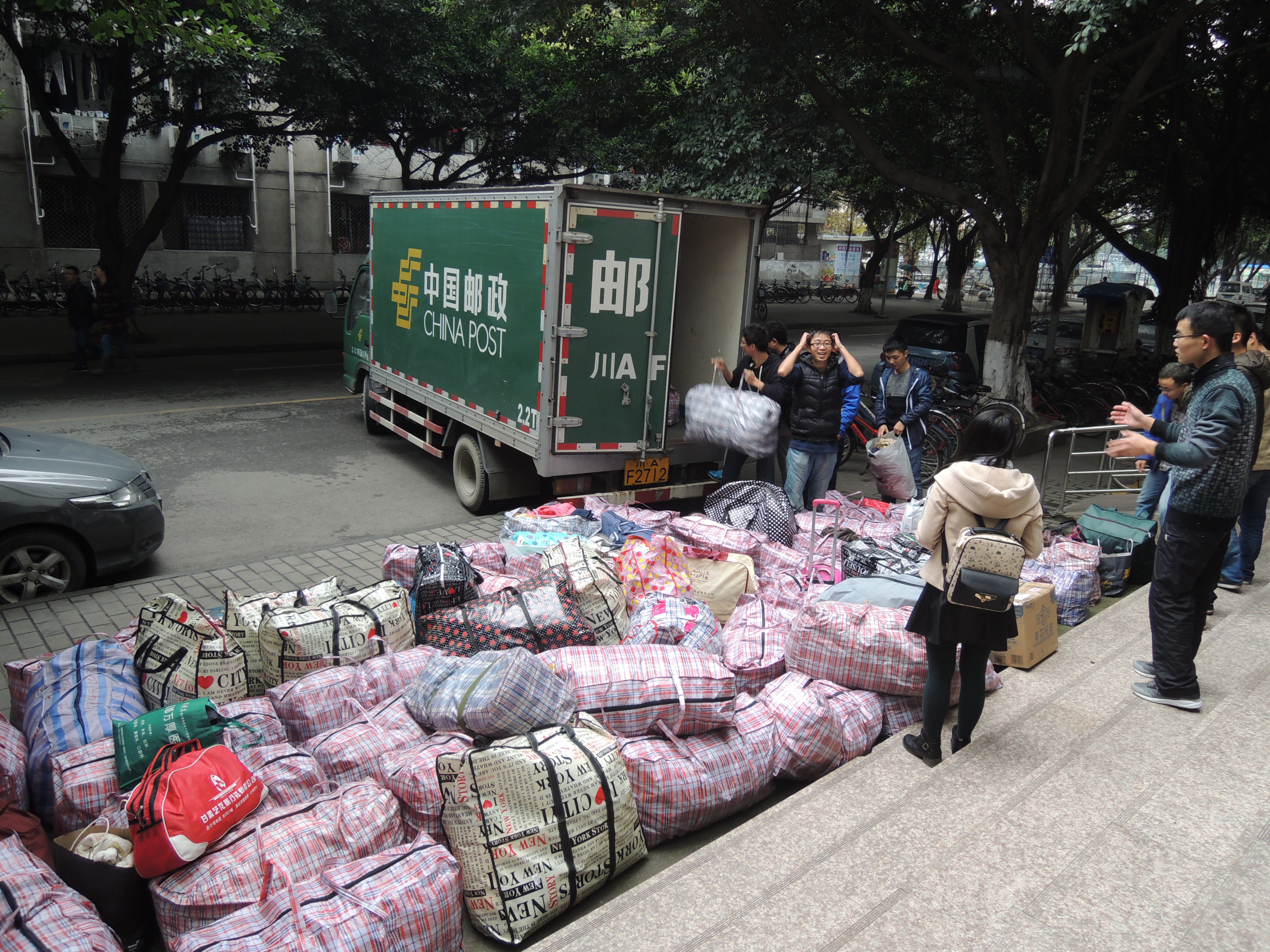每天到了当日募捐活动结束的时候,仍有源源不断的同学将衣服给我们提过来。经过两日的募捐,我们收到的衣服数量远远超过了我们的预算,最后,我们一共整理出65个编织袋的募捐衣服。这么多的衣服,搬运不轻松,邮费也不菲,但是一想到能为美姑县的孩子们带来一些温暖,还有什么不能克服的呢!在联系好邮局以后,18日一大早我们志愿者们便开始将衣物搬运至邮局准备寄送,直到下午一点,寄送的工作才顺利完成,这里特别要感谢我们的志愿者们,因为很多志愿者连午饭都没来得及吃,一直都在现场帮忙打包和搬运。