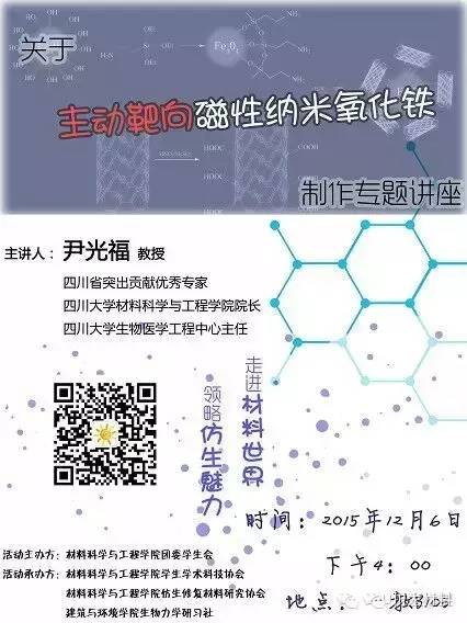 为了增进同学们对仿生修复材料的认识和兴趣,进一步提高同学们的科技创新能力,促进大学生学以致用,积极参与材料科学与工程相关领域研究,经taptap点点官方网站团委学生会决定,于2015年12月6日16:00,在taptap点点官方网站江安校区第一基础教学楼B座103教室,开展关于主动靶向磁性纳米氧化铁的制作专题讲座。
