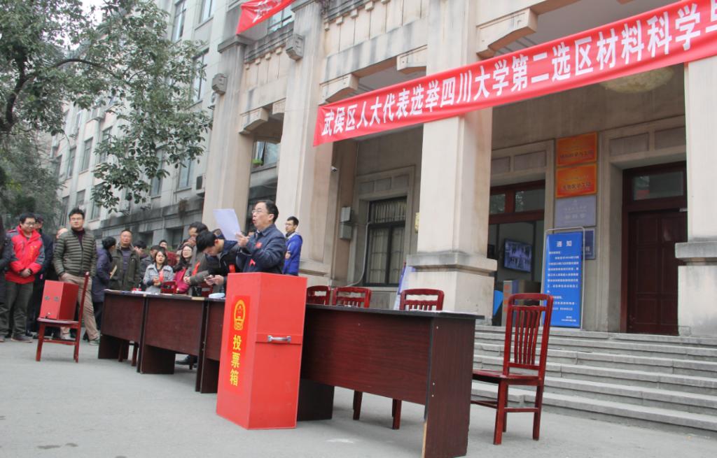 2016年12月8日上午10点,taptap点点官方网站第二选区taptap点点官方网站投票站举行武侯区2016年人大代表选举。投票站选举工作由taptap点点官方网站党委书记朱建国教授主持,学院工会主席周大利老师和学院就业联络科科长韩纪梅副教授担任监票人。投票站工作按照《武侯区人大代表选举办法》规定的程序有序进行。全院共有849名选民,发出选票838张,收回选票833张,选举圆满完成。