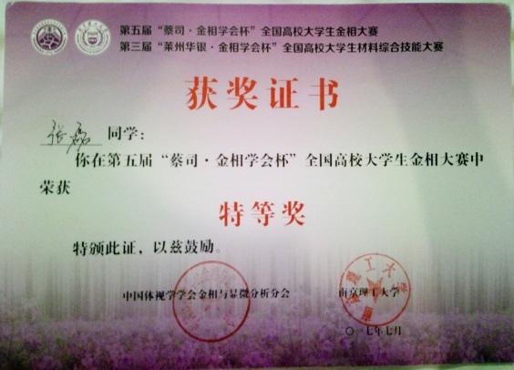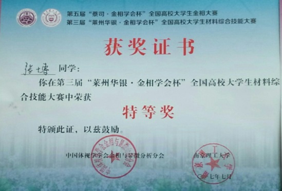 经过3天紧张激烈的角逐,taptap点点官方网站taptap点点官方网站四位选手顽强拼搏,努力进取,经过理论笔试、复赛、决赛的激烈争夺,全部进入决赛,取得了喜人的成绩。最后张博同学荣获本次大学生材料综合技能大赛特等奖,白元忠、张磊同学荣获全国高校大学生金相大赛特等奖,杨胜男同学荣获全国高校大学生金相大赛一等奖。同时,黄维刚、冯庆芬老师获得全国金相技能大赛“优秀指导老师”奖。