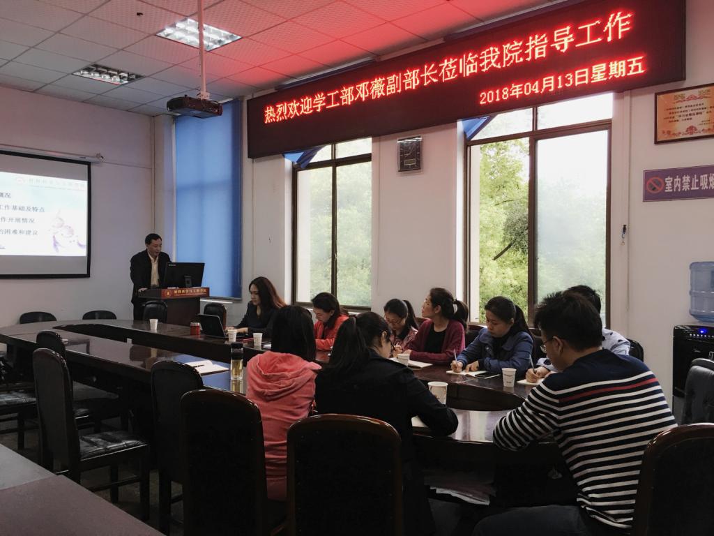 2018年4月13日,学工部邓薇副部长一行来taptap点点官网就学生工作开展调研,在taptap点点官方网站会议室召开调研座谈会。张晓满副书记首先交流汇报了taptap点点官网学生工作概况以及在学生中深入开展学习宣传贯彻习近平新时代中国特色社会主义思想和党的十九大及十九届一中、二中、三中全会精神、两会精神等活动情况,介绍了taptap点点官网对于学生安全教育管理、能力提升等专项工作情况,并就辅导员队伍职业化专业化建设等问题与学工部领导进行了深入交流。邓薇部长对taptap点点官网的学生工作成效表示肯定,并且传达了学工部对于下一阶段学生工作的重点部署,强调了严格日常管理等工作要点。