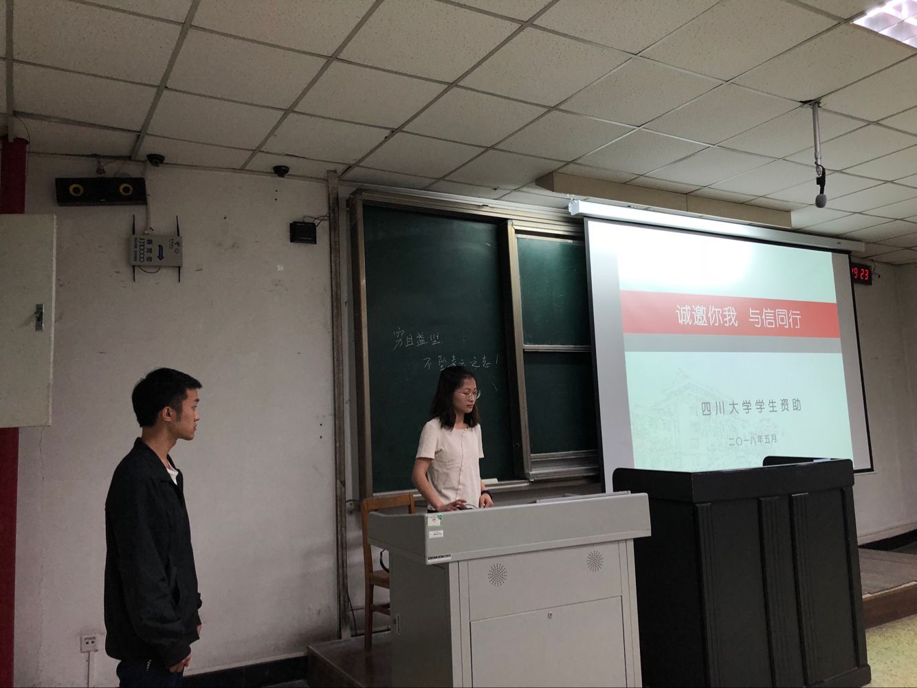 2018年5月4日晚七点,taptap点点官方网站2015级资助诚信宣讲在望江校区基教c座102顺利进行。