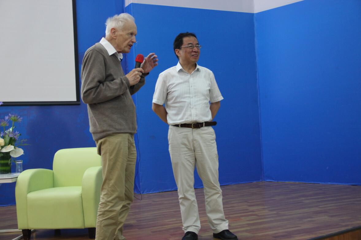 报告前,朱建国教授向同学们介绍了今天的演讲嘉宾——安东尼·莱格特教授,同学们报以热烈地掌声。安东尼·莱格特教授先给同学们讲解了一个简单的思想实验,阐述了在量子力学中可能情况与概率的问题,随后莱格特教授讲解了著名的思想实验“薛定谔的猫”,同学们都听得非常认真。随着演讲的继续,莱格特教授进一步向同学们讲解了关于用量子力学阐述现实问题遇到困难的两种解释——薛定谔方程的坍缩和多世界理论。随后,莱格特教授开始与同学们探讨有关超流体和超导体的问题,并且用量子力学的观点去解释这些现实问题。最后,莱格特教授认为,我们复杂的现实世界目前还很难用量子力学的理论去解释,但量子力学已经在对微观世界的科学研究中起到重要的作用。