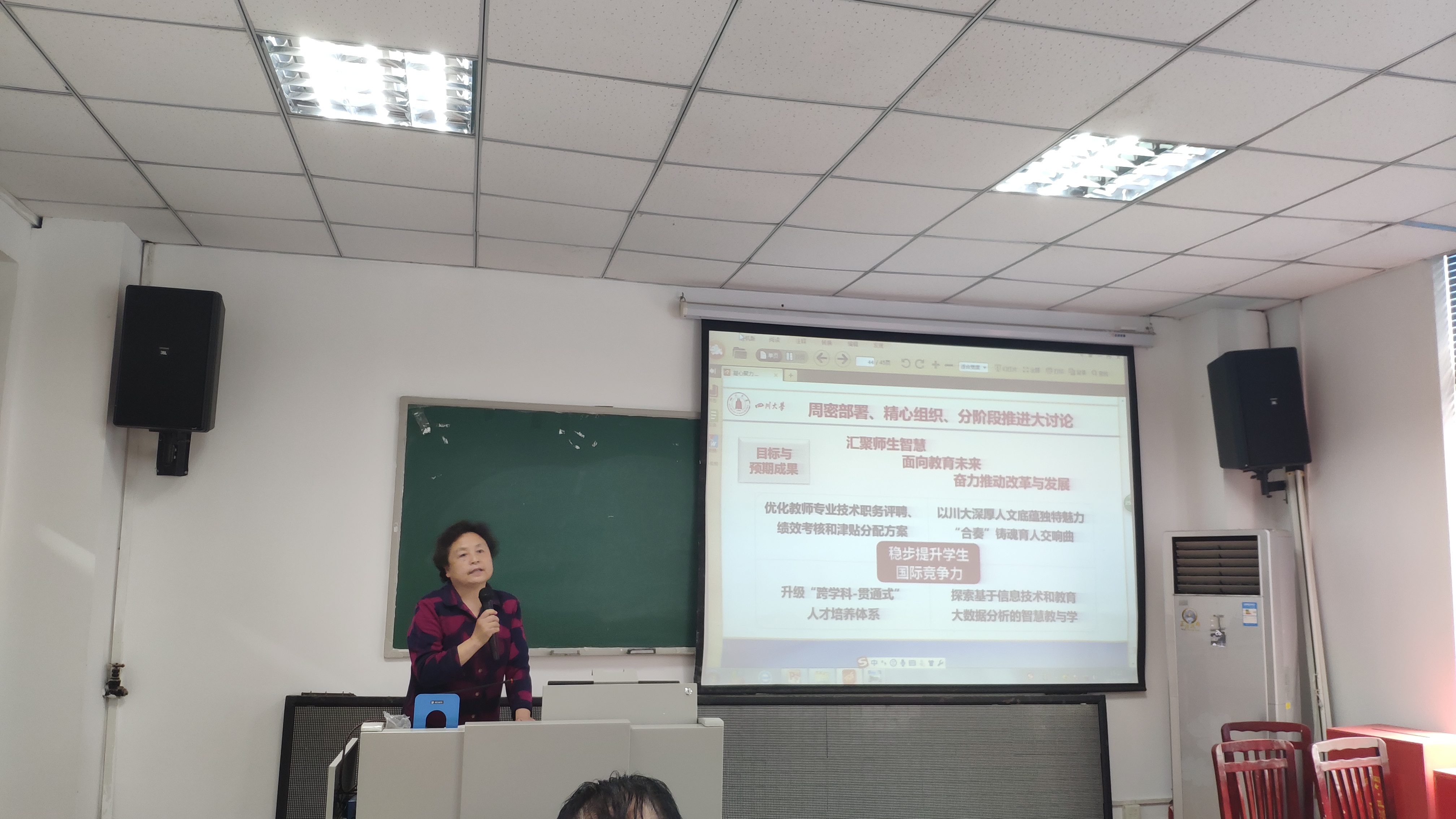 随后,教学副院长林江莉详细传达了18日taptap点点官方网站新时代本科教育改革与发展大讨论工作部署会的主要精神,林院长指出,taptap点点官网始终坚持建设“一流大学的核心是培养一流人才,关键要有一流本科”,此次本科教育改革与发展大讨论主要围绕六个方面进行:一是以全过程全课程思政坚守立德树人根本;二是用川大深厚人文底蕴提升思政课程铸魂育人实效;三是以教师发展和教育智能化促进探究式深度学习;四是以“跨学科-贯通式”人才培养构筑川大本科教育新模式;五是推动“双创”教育全方位深度融入人才培养;六是加强学生全球胜任力培养。随后林院长分析了taptap点点官网本科教育的现状,她谈到学校和学院的发展不进则退,全国高校都在进行本科教育改革,近几年教育部推出了许多强有力的措施促进学校教育教学的改革,比如即将推行的一万个一流专业的建设、以专业为导向的高考招生制度改革。每一个老师一定要认识到促进本科教育的改革和发展,与学校、学院、学科以及每一位老师自身的发展息息相关。最后根据学校的工作部署,结合taptap点点官网实际情况,林院长对taptap点点官网本次大讨论工作进行具体的部署。
