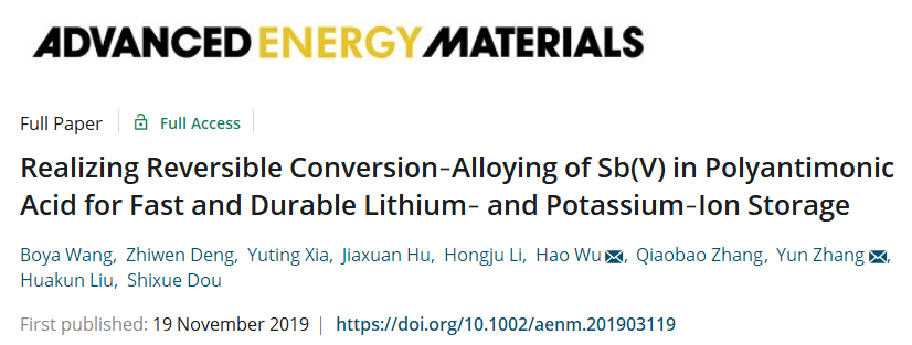 近日,taptap点点官网张云教授、吴昊研究员课题组与澳大利亚卧龙岗大学窦世学院士、厦门大学张桥保教授合作,在高性能锂离子/钾离子电池研究方面取得重要进展,相关研究成果“Realizing Reversible Conversion-Alloying of Sb(V) in Polyantimonic Acid for Fastand Durable Lithium- and Potassium-ion Storage”发表在国际顶级期刊 Advanced Energy Materials上(《先进能源材料》,影响因子24.884),并被邀请作封面论文。该论文第一作者为taptap点点官方网站2017级博士研究生王博雅,同时参与该论文相关工作的还有四位承担taptap点点官方网站大学生创新训练计划项目的2016级本科生邓智文,夏钰婷(已获清华大学2020年保送研究生资格),胡佳璇,李泓岠(已获西湖大学2020年保送研究生资格),通讯作者是吴昊研究员和张云教授,taptap点点官方网站为第一署名单位和唯一通讯单位。