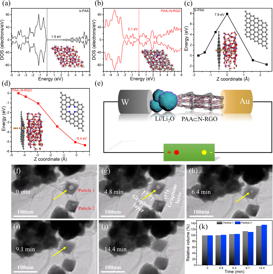 因此,课题组研究人员通过纳米结构调控与导电网络构筑相结合的合成策略,成功设计并制备出一种新型的内部含空隙的聚锑酸纳米八面体与氮掺杂石墨烯结合的复合材料。与纯的聚锑酸(4.8×10-10 S cm-1)相比,聚锑酸/石墨烯复合材料的电子导电率提高了近10个数量级(3.3 S cm-1)。电化学测试表明,复合材料作为锂离子电池负极表现出了高达847 mAh g-1的可逆比容量。而且,聚锑酸独特的三维开放式隧道结构十分有利于离子的快速扩散(DLi+ =10-8 cm2 s-1),因而复合材料还具有极优异的快充快放的倍率特性,电池在20 A g-1的超高电流密度下,充放电一次仅需26秒。原位和非原位透射电子显微镜研究结果也表明,纳米八面体聚锑酸颗粒内部的空隙以及外部包覆的石墨烯可以容纳并限制材料在放电时产生的体积膨胀,从而极大地改善材料的循环性能,因此该复合材料也可稳定循环800次,容量保持率达93.5%。