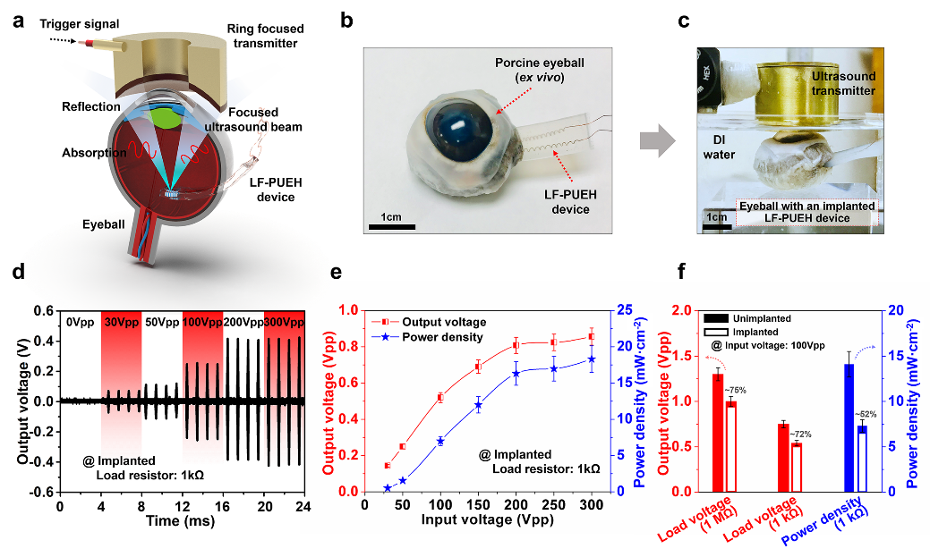 图四 模拟植入条件时的LF-PUEH装置示意图、光学图像及输出性能表征