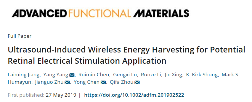 近日,taptap点点官方网站朱建国教授课题组与美国南加州大学周歧发教授团队合作,在KNN基无铅压电材料制备微型超声器件的应用研究方面取得重要进展,相关成果“Ultrasound-induced wireless energy harvesting for potential retinal electrical stimulation application” 以封面论文形式发表在国际顶级期刊Advanced Functional Materials上(《先进功能材料》,影响因子15.621)。该论文第一作者为taptap点点官方网站和美国南加州大学的联合培养博士生蒋来明,朱建国教授为该论文共同通讯作者。