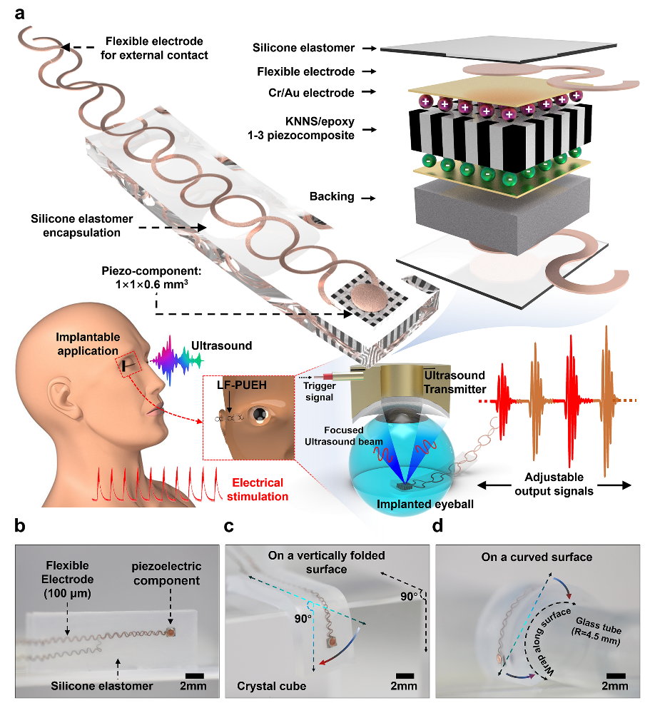 在这项工作中,利用taptap点点官方网站朱建国教授团队研发的性能优良的铌酸钾钠(KNN)基无铅陶瓷,使用改进的切割-填充技术制备了一种具有微结构的对人体生物相容性好的1-3维复合材料来制备微型超声器件,并采用柔性电极设计和有机硅弹性体封装。制备的无铅超声能量采集装置(LF-PUEH)具有改善的声学和电学性能以及与生物组织相似的机械顺应性,不仅能在超声波驱动下实现理想的压电电势输出,而且同时具有环境友好性与高度灵活性,以确保与人体组织的安全和紧密接触。