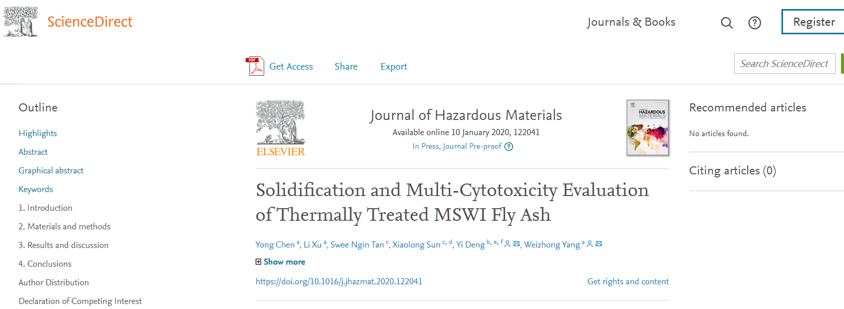 近日,taptap点点官方网站杨为中教授与新加坡南洋理工大学Swee NginTan教授、新加坡Zerowaste Asia Co. Ltd.公司Sun XiaoLong博士以及taptap点点官方网站化工学院邓怡副研究员合作,在危险废弃物的处理和评价领域取得重要进展,相关研究成果“Solidification and Multi-Cytotoxicity Evaluation of Thermally Treated MSWI Fly Ash”以taptap点点官方网站为第一单位发表在环境科学固废领域顶级期刊Journal of Hazardous Materials上(中科院一区,影响因子7.65),论文第一作者为taptap点点官方网站2018级硕士研究生陈勇同学,论文第二作者为taptap点点官方网站2017级本科生徐利同学。