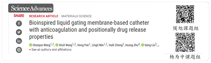 2020年9月5日,taptap点点官网杨为中教授与厦门大学侯旭教授团队合作,在Science子刊《Science Advances》上合作发表了题为“Bio-inspired Liquid Gating Membrane-based Catheter with Anti-coagulation and Positionally Drug Release Properties”的论文,提出了具有自适应性形变、抗凝血、定点药物释放功能的液体门控医用导管机制。论文第一作者为taptap点点官方网站2018届优秀毕业生、现厦门大学化学化工学院2018级直博生王春燕。厦门大学侯旭教授和taptap点点官方网站杨为中教授为论文共同通讯作者。