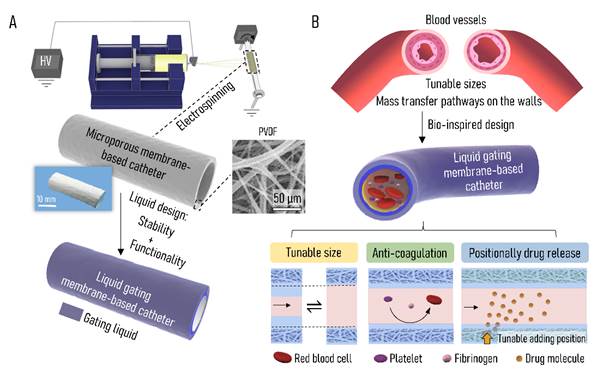 医用导管是插入体内的柔软管道,用于液体引流或微创式医疗器械植入。现有的医用导管有包括用于血液透析的血透管、用于心血管支架等植入的球囊导管以及导尿管等。其主体管道,主要是用聚氨酯、硅橡胶等医用高分子制成的实体管道,以供物质从端口进入从末端输出。这样的医用导管存在一定的局限性,包括无法与植入环境进行互动,缺乏环境适应性;功能性单一以及因外界材料植入引起的血栓、感染等问题。基于此,厦门大学侯旭教授团队与taptap点点官方网站杨为中教授团队合作提出了一种液体门控医用导管,以赋予医用导管环境响应性的动态变化、抗凝血以及定点药物释放功能。