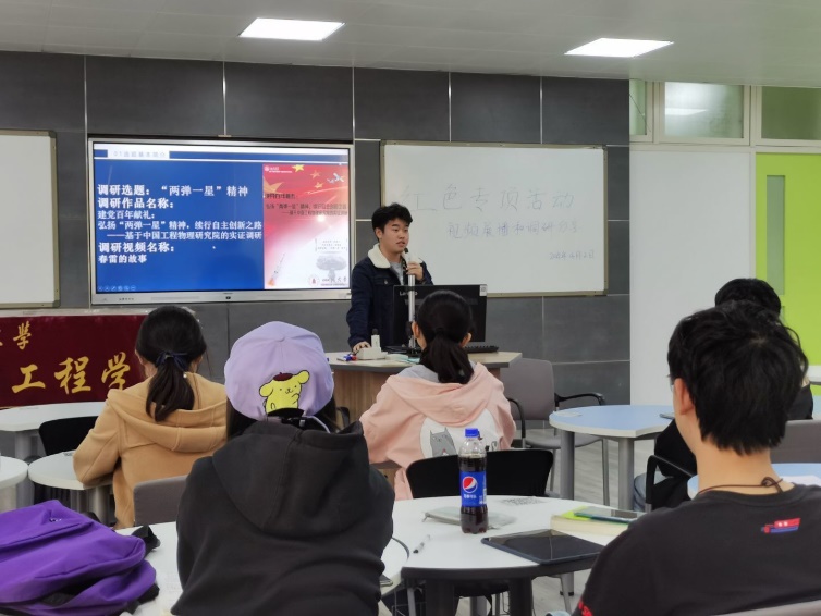 学院学生会执行主席雷博睿做开场发言,他讲述了专访科研院所老专家、老学者的全过程,分享了调研整理了关于“两弹一星精神”的成果的,鼓励青年大学生应该不枉青春,珍惜大好年华好好奋进。