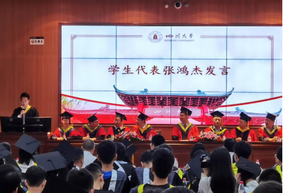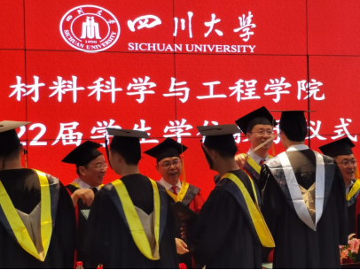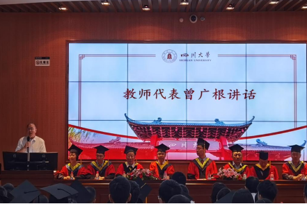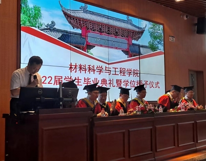 教师代表曾广根在发言中向毕业生们分享了三个质朴且含意深远的词语—“融合”、“靠谱”、“奋斗”,他希望同学们毕业后继续书写海纳百川,有容乃大的荣光,做一个靠谱的材料人,更要做一个靠谱的青年人!