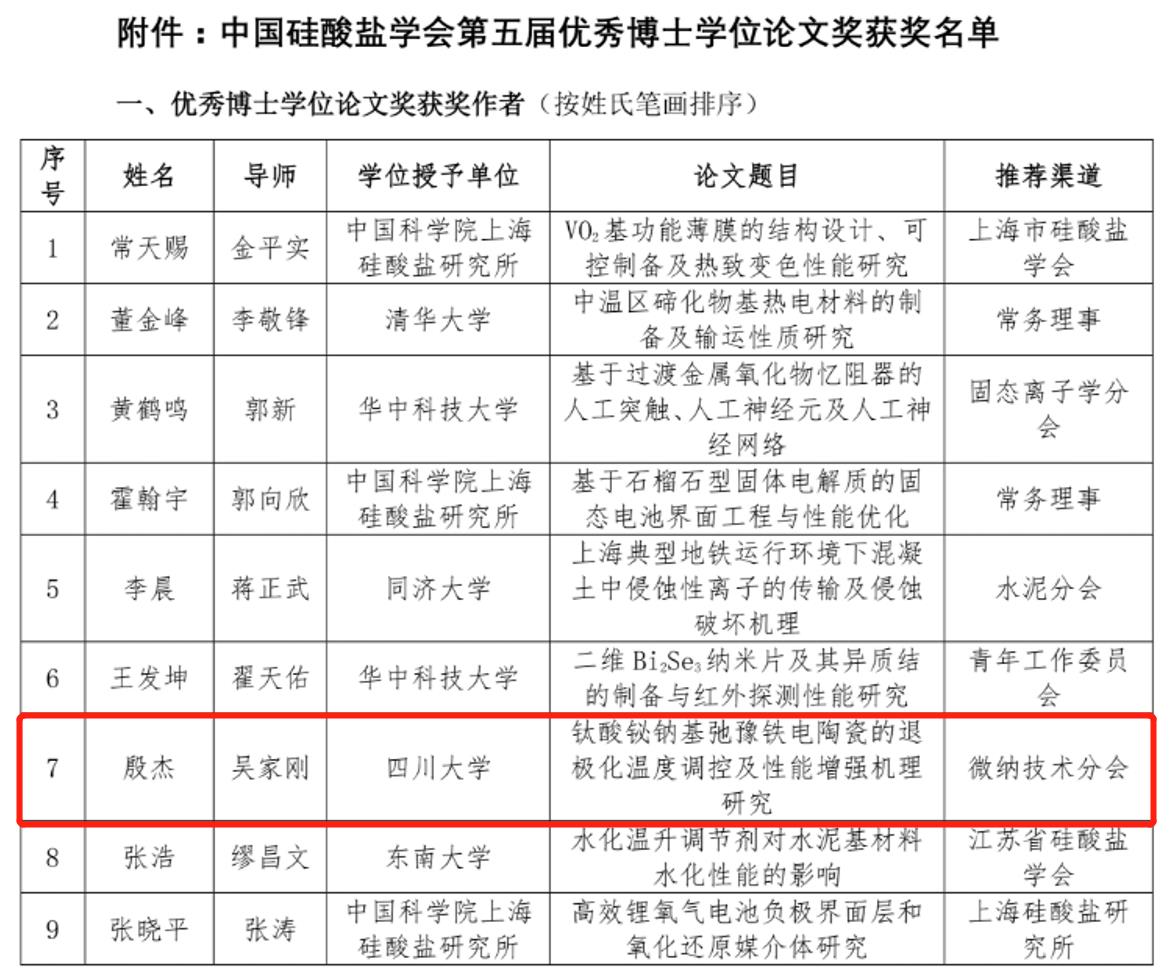 为促进我国无机非金属材料学科的发展,加强高层次创新性人才的培养工作,鼓励创新精神,提高博士研究生的教育质量,根据《中国硅酸盐学会优秀博士学位论文评选办法(试行)》规定,经专家评审委员评审、学会第九届理事会第六次常务理事会审议批准,taptap点点官方网站,吴家刚教授指导的博士生殷杰完成的博士学位论文《钛酸铋钠基弛豫铁电陶瓷的退极化温度调控及性能增强机理研究》荣获中国硅酸盐学会第五届优秀博士学位论文奖。该论文以钛酸铋钠(BNT)基弛豫铁电陶瓷为研究对象,以电学性能改性、结构操控并阐明其物理机制为目标,开展了系统且深入的研究工作。本届共有9篇博士学位论文获奖,5篇博士学位论文获提名奖。