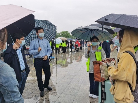 刘颖、徐海鑫冒雨前往江安校区青春广场迎新点,对坚守岗位的师生志愿者表示了深切慰问,同新生进行了亲切交流并表示了热烈欢迎。