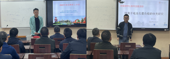 在专题学习之前,中心新进教师尧猛老师做了自我介绍。学习结束后,蔡文龙老师为全体中心老师做了关于“锂离子电池石墨负极的快充研究”的交流报告。蔡老师系统地分析了金属锂在石墨负极的沉积和枝晶生长是限制锂离子电池快充性能的主要原因,并分享了从石墨电极界面、充放电协议及析锂认识等角度提升锂离子电池快充技术的研究工作。报告结束后,与会老师进行了热烈的学术讨论。本次学术交流活动,是新能源中心“永远跟党走,建功新能源”主题学术交流系列活动之一。