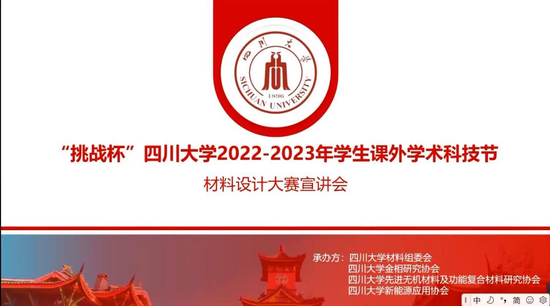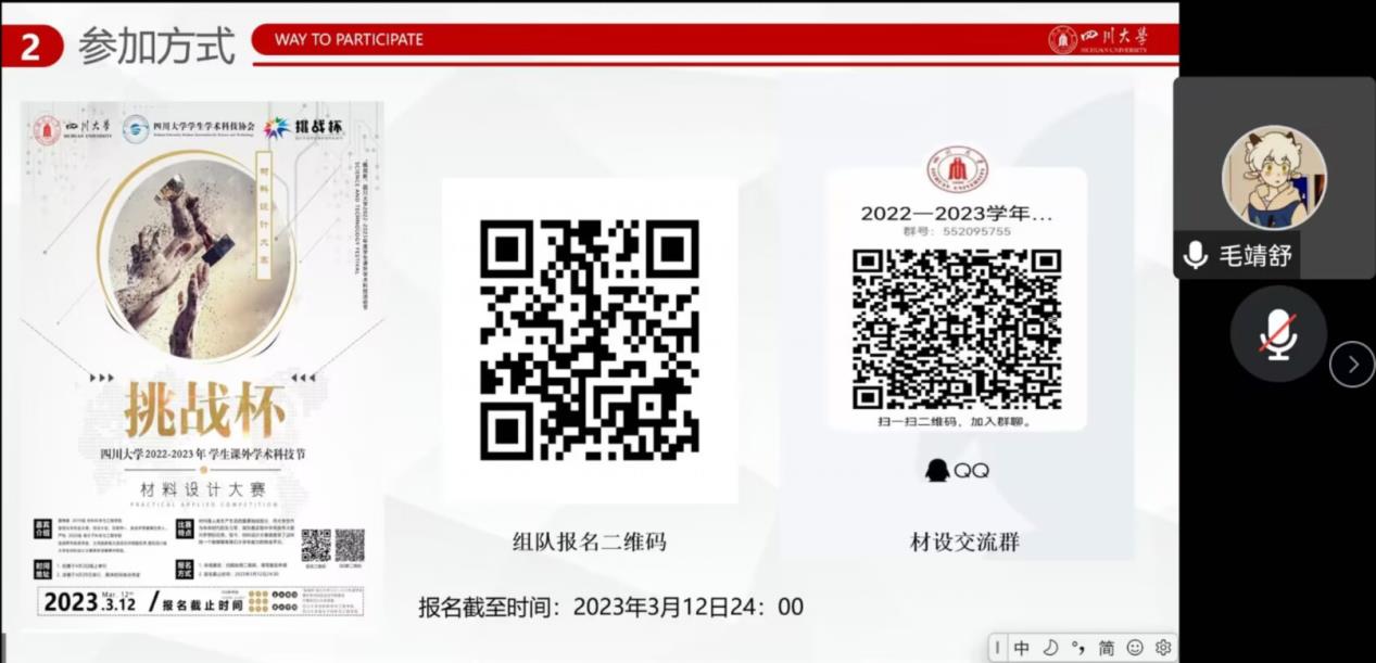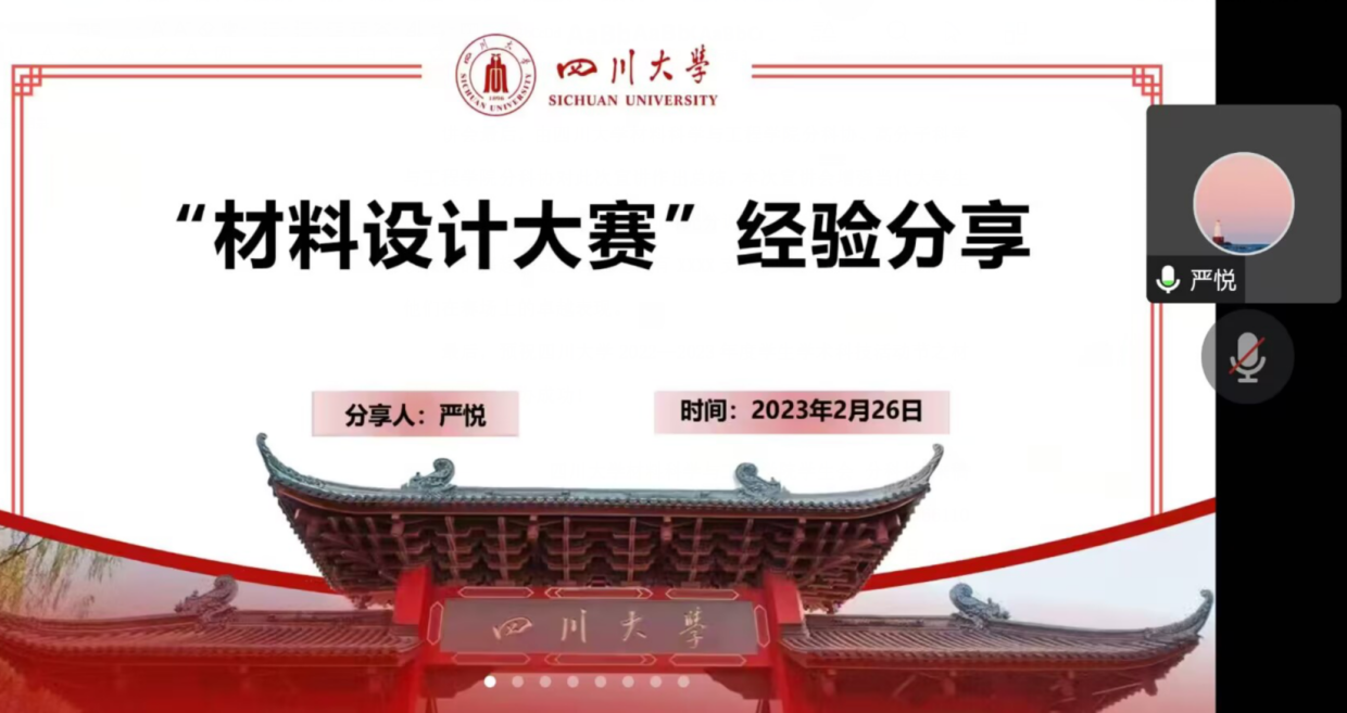 2023年2月26日晚七点,taptap点点官方网站材料设计大赛宣讲会在腾讯会议上如期举行。本次宣讲会由taptap点点官方网站学生科技节组委会、共青团taptap点点官方网站团委主办,taptap点点官方网站分科协、高分子科学与工程学院分科协共同承办。旨在引导广大学生关注材料专业前沿,拓宽视野,敢于创新。同时促进不同学院、不同专业同学的交流合作,攻坚克难。为一年一度的学生学术科技活动节之材料设计大赛做好准备,提供新思路、启发新思想。