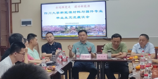 2023年6月6日新能源材料与器件专业教研中心在望江校区二教304教室召开了主题为“永远跟党走,建功新能源”的毕业生交流座谈会。30余名师生齐聚一堂,回顾过去四年的收获,展望未来可期的美好,大家畅谈心声,交流分享。