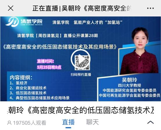 本次报告围绕我国氢能储运装备发展现状及发展趋势进行探讨,重点分析了高压气态储氢、液氢、有机液态储氢、金属固态储氢,以及管道输氢、长管拖车运氢等市场上关心的技术,重点剖析高密度高安全的低压固态储氢技术及其适宜的应用场景,为相关企业及高校科研院所提供了沟通交流平台。直播有近二十万氢能行业相关人士观看,课后吴朝玲教授与观众展开互动,获得了业内一致好评。