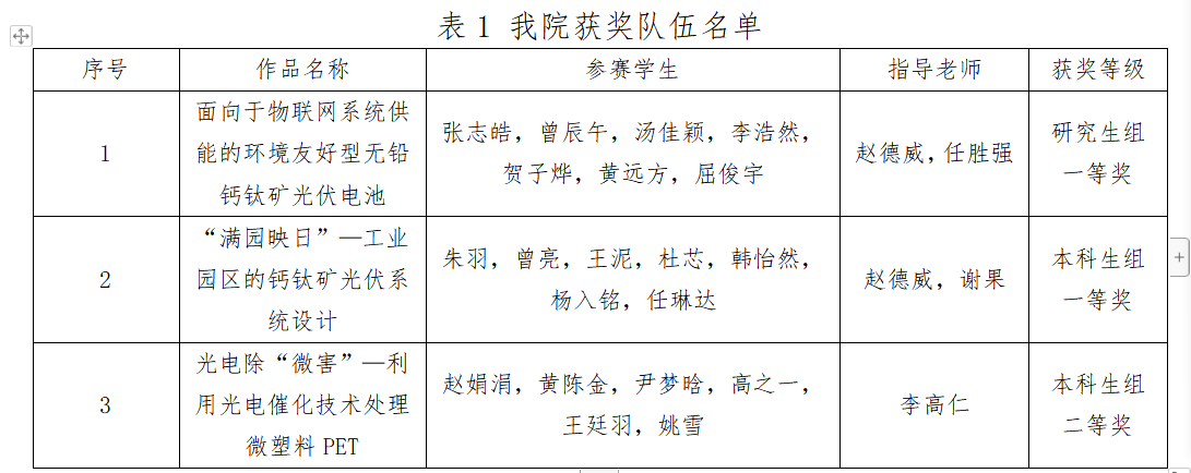 taptap点点官网参赛团队结合学院新能源材料与器件专业特色,将“节能减排,绿色发展”的理念贯穿始终。在学校和学院的大力支持下,taptap点点官网研究生科技类项目“面向于物联网系统供能的环境友好型无铅钙钛矿光伏电池”和本科生科技类项目“‘满园映日’—工业园区的钙钛矿光伏系统设计”均荣获一等奖,本科生科技类项目“光电除‘微害’—利用光电催化技术处理微塑料PET”荣获二等奖。