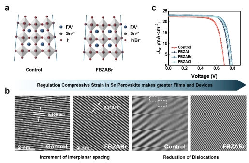 图1. a)应变工程调控锡基钙钛矿示意图,b)Control和FBZABr修饰薄膜的TEM表面形貌图以及衍射图,c)不同程度残余应变的锡基钙钛矿太阳电池J-V曲线