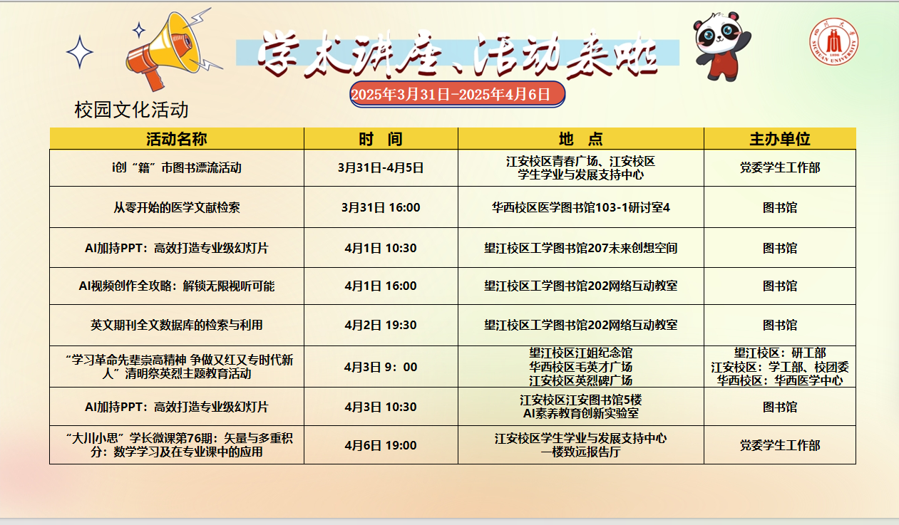 校园文化活动预告(2025年3月31日-2025年4月6日)
