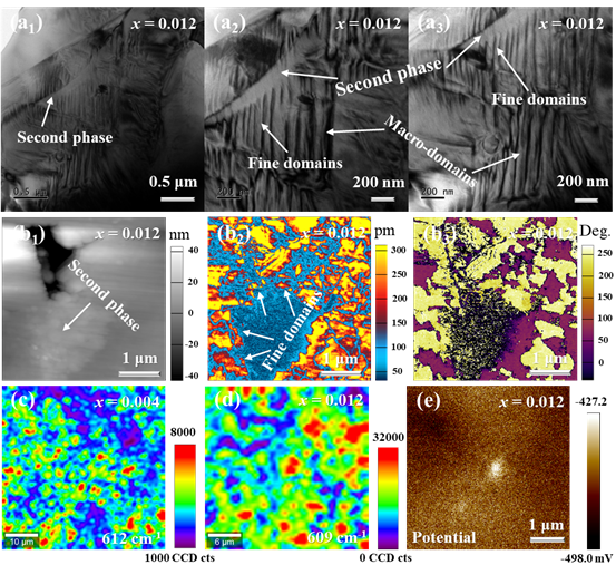 图2.(a1)通过TEM图像呈现的KNN/0.012 CSO样品的畴结构形貌。(a2)与(a3)分别为(a1)中局部区域的放大图。(b1-b3)利用面外PFM模式对KNN/0.012 CSO样品电畴进行的详细表征,分别对应形貌图、振幅图和相位图。拉曼面扫结果以色阶形式展示,其输出参数为特征峰面积—图中颜色越亮代表峰面积越大,反之则越小。其中(c)以KNN/0.004 CSO陶瓷的612 cm-1特征峰面积为参数,(d)以KNN/0.012 CSO陶瓷的609 cm-1特征峰面积为参数。(e)KNN/0.012 CSO样品的表面电势分布图。