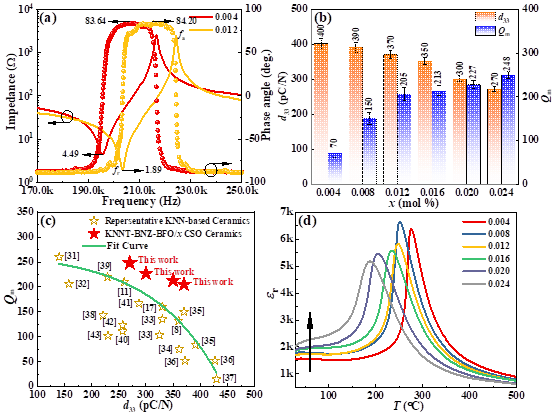 图3.(a)极化后复合陶瓷在谐振与反谐振频率附近的阻抗及相位角频谱。通过测量样品在谐振频率附近的阻抗与相位角频率谱,表征其机电性能。(b)d33与Qm值随CSO含量变化的函数关系。(c)KNN/x CSO复合陶瓷与其他已报道KNN基体系陶瓷的综合性能对比。(d)复合陶瓷在30至500 °C温区内的相对介电常数-温度曲线。