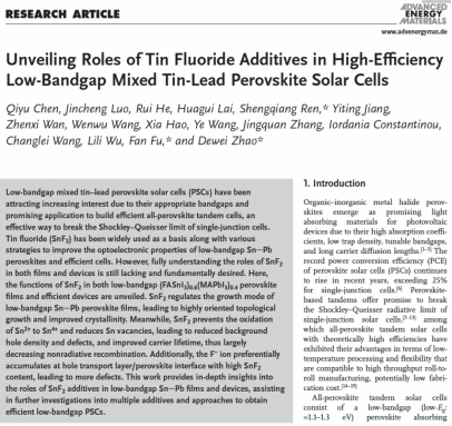 文章链接:“Unveiling Roles of Tin Fluoride Additives in High-Efficiency Low-Bandgap Mixed Tin-Lead Perovskite Solar Cells”(https://onlinelibrary.wiley.com/doi/10.1002/aenm.202101045)