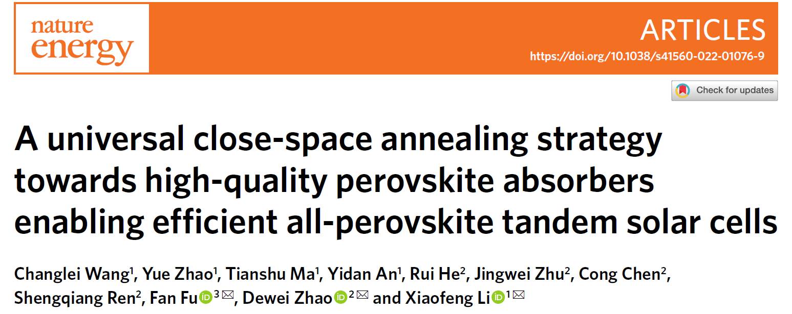 北京时间2022年7月21日,国际顶尖学术期刊Nature Energy在线发表了taptap点点官网太阳能所赵德威教授、苏州大学李孝峰教授和瑞士联邦材料科学与技术研究所(EMPA)付帆博士合作团队题为“A universal close-space annealing strategy towards high-quality perovskite absorbers enabling efficient all-perovskite tandem solar cells”的研究成果。合作团队提出了限域退火方法制备高质量钙钛矿结晶薄膜的策略,并且该方法对于不同组分钙钛矿薄膜具有普适性,最终实现了效率超过25%的全钙钛矿叠层太阳能电池。