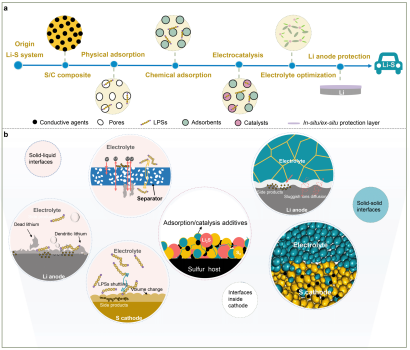 图1(a)锂硫电池相关研究的发展过程,(b)锂硫电池中界面和界面挑战的示意图