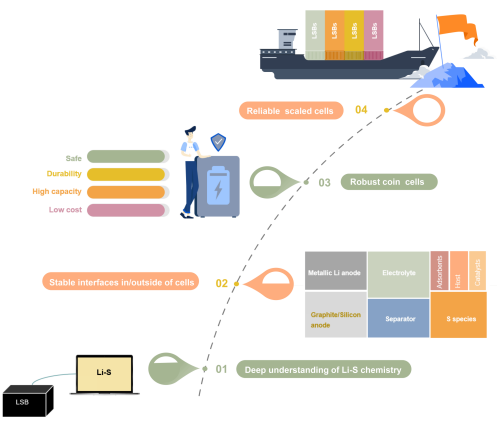 锂硫电池是一种高能量密度的可充电电池,被视为后锂离子电池技术的代表之一。其工作原理是利用硫和锂之间的电化学反应实现能量的存储和释放。硫资源丰富、成本低廉且比容量高,锂硫电池具有非常高的能量密度,有望解决目前锂电池续航里程短、充电时间长等问题。然而,锂硫电池在实际应用中仍面临许多挑战,其中界面不稳定问题尤为突出。在锂硫电池中,存在着电极与电解质的界面、隔膜与电解质的界面、电极内部各组分之间的界面等多重界面。而且,由于正极充放电产物(硫/硫化锂)的电子导电率低、密度差异大以及充放电中间产物在液态电解质中的高溶解性等问题,导致锂硫电池的界面问题比传统锂离子电池更严峻。这些界面在结构、成分、状态、反应动力学、晶体学、热力学等方面都面临着挑战,多界面导致锂硫电池的容量衰减快、寿命短、充电/放电效率低。