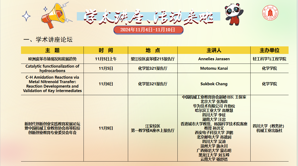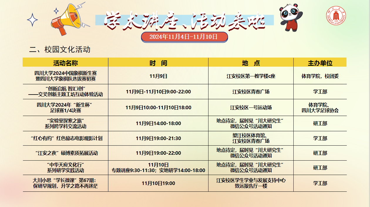 学术讲座论坛及校园文化活动预告(2024年11月4日-11月10日)
