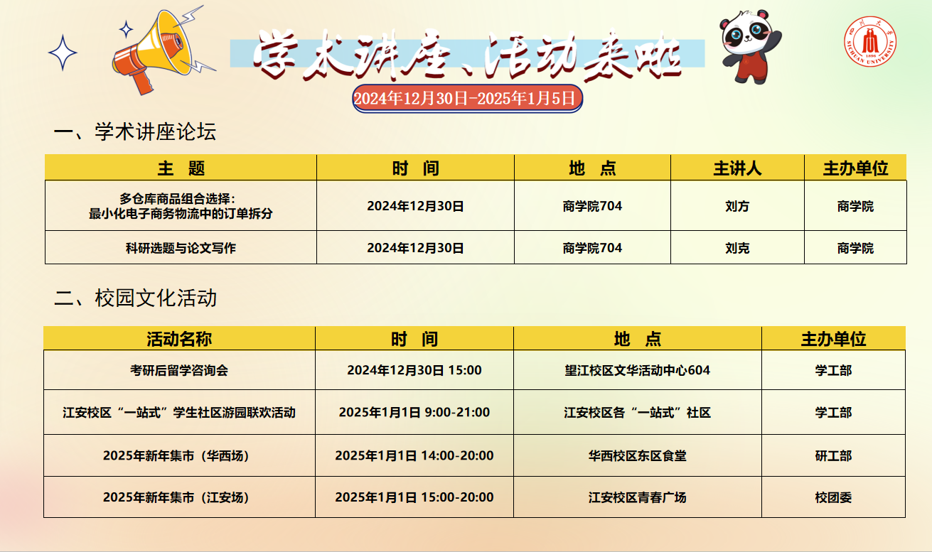 学术讲座及校园活动文化预告(2024年12月30日-2025年1月5日)