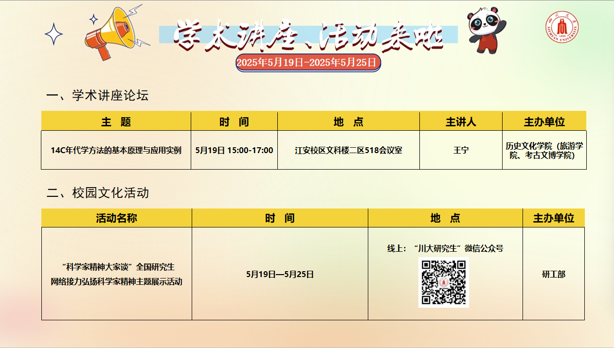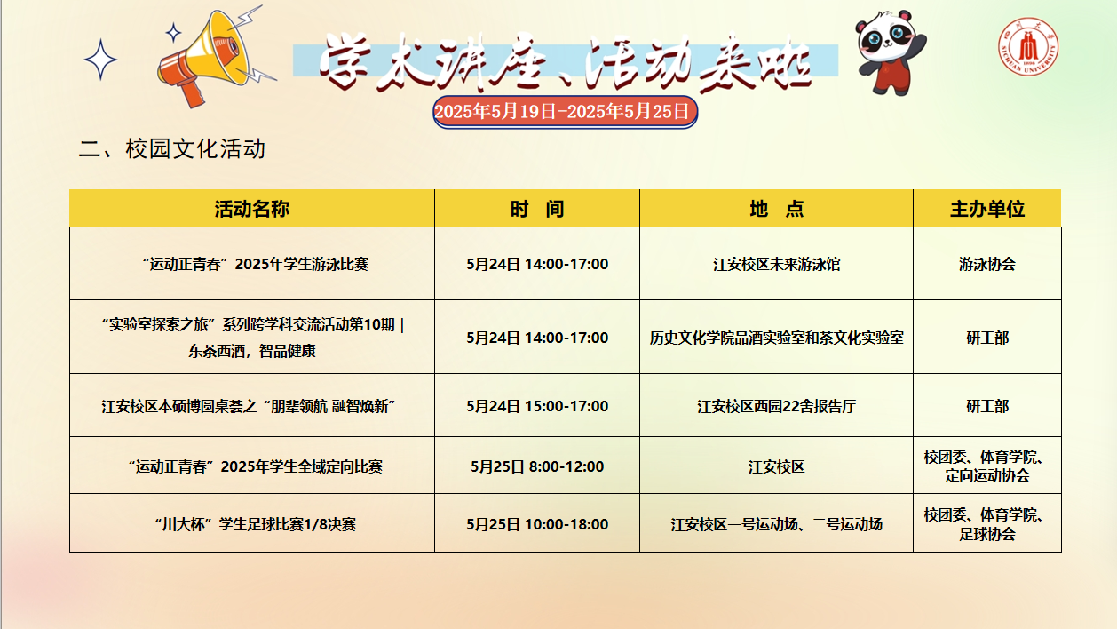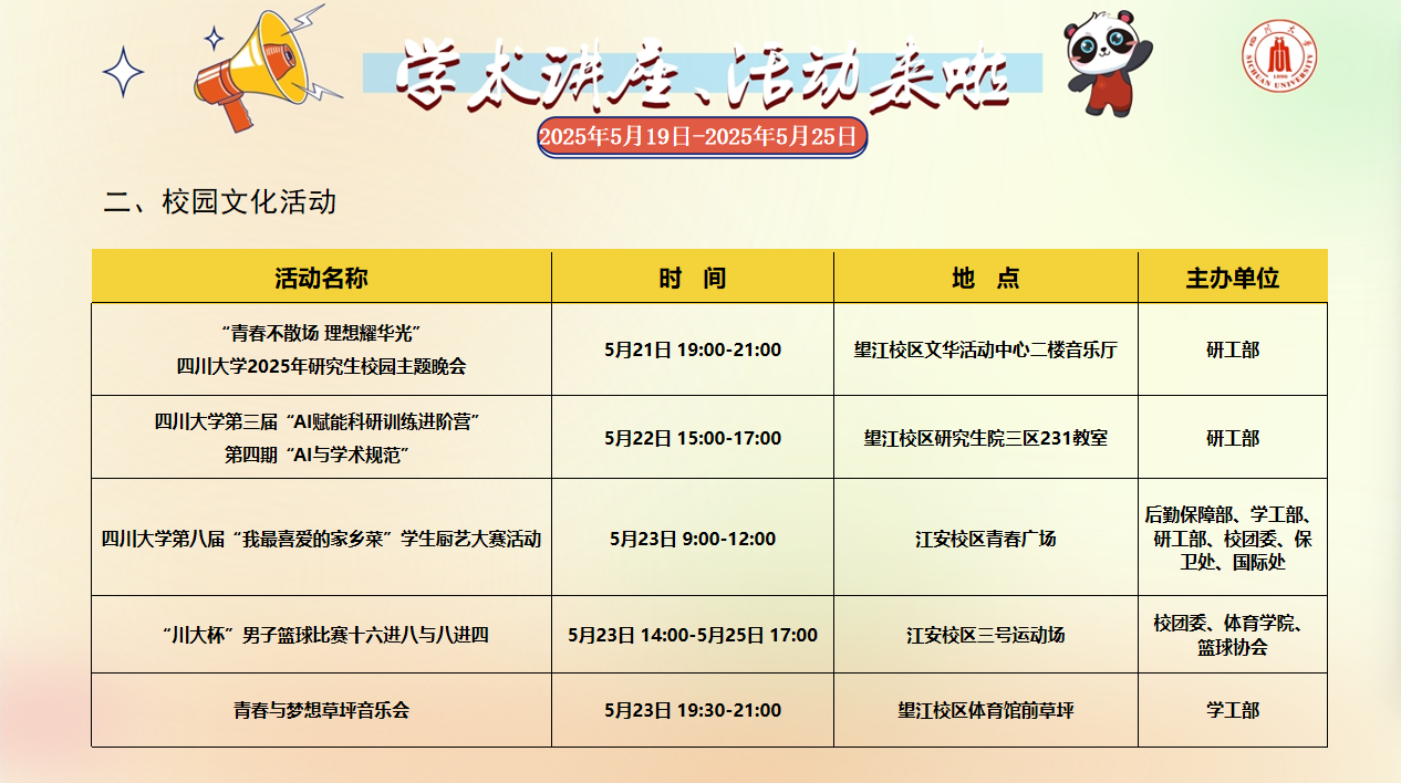 学术讲座论坛及校园文化活动预告(2025年5月19日-2025年5月25日)