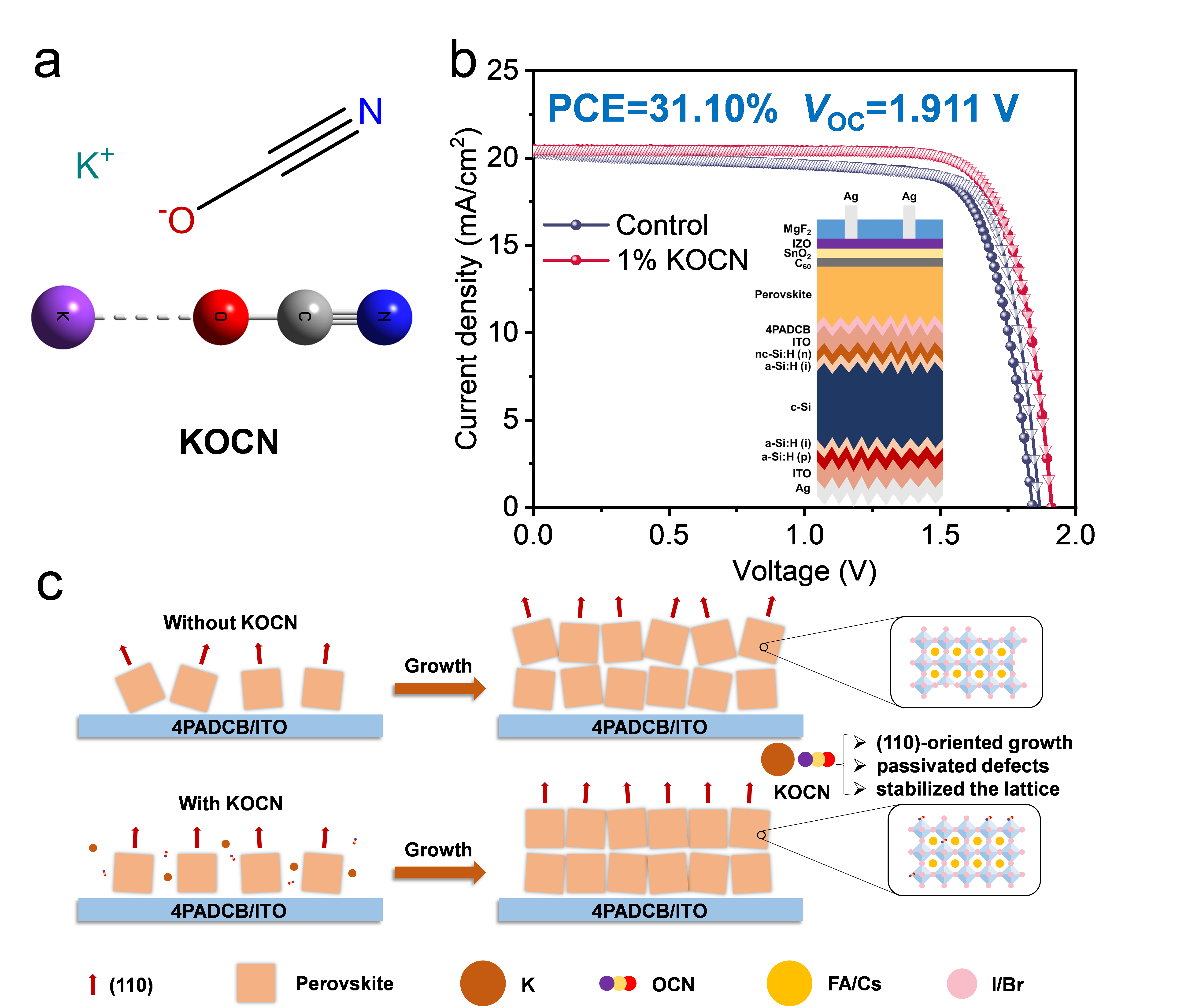 图1. KOCN的结构、作用机制及钙钛矿/晶硅叠层电池的光电性能