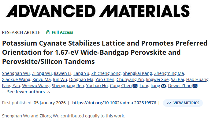 近日,taptap点点官网taptap点点官方网站赵德威教授团队在宽带隙钙钛矿及钙钛矿/晶硅叠层太阳电池结晶调控与性能提升方面取得最新研究进展。相关成果“Potassium Cyanate Stabilizes Lattice and Promotes Preferred Orientation for 1.67‑eV Wide‑Bandgap Perovskite and Perovskite/Silicon Tandems”发表于《Advanced Materials》(中科院一区,川大A-级期刊,影响因子26.8)。taptap点点官方网站为该论文第一完成单位,taptap点点官网赵德威教授、陈聪副研究员、中国石油集团工程材料研究院蒋龙博士为论文的通讯作者,taptap点点官网2023级博士研究生吴生晗、2023级硕士研究生吴子龙为论文的共同第一作者。