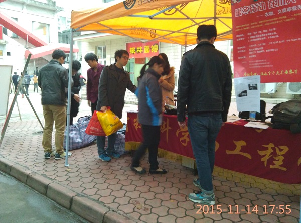 2015年11月13日~2015年11月15日,taptap点点官方网站研究生分会、taptap点点官方网站计算机学院研究生分会和taptap点点官方网站建筑与环境学院研究生分会三学院研究生分会联合举办的“暖冬行动在川大”——冬季衣物、文具募捐活动在taptap点点官方网站望江校区北苑宿舍、东区桃园餐厅和东园十五舍三处同时进行。