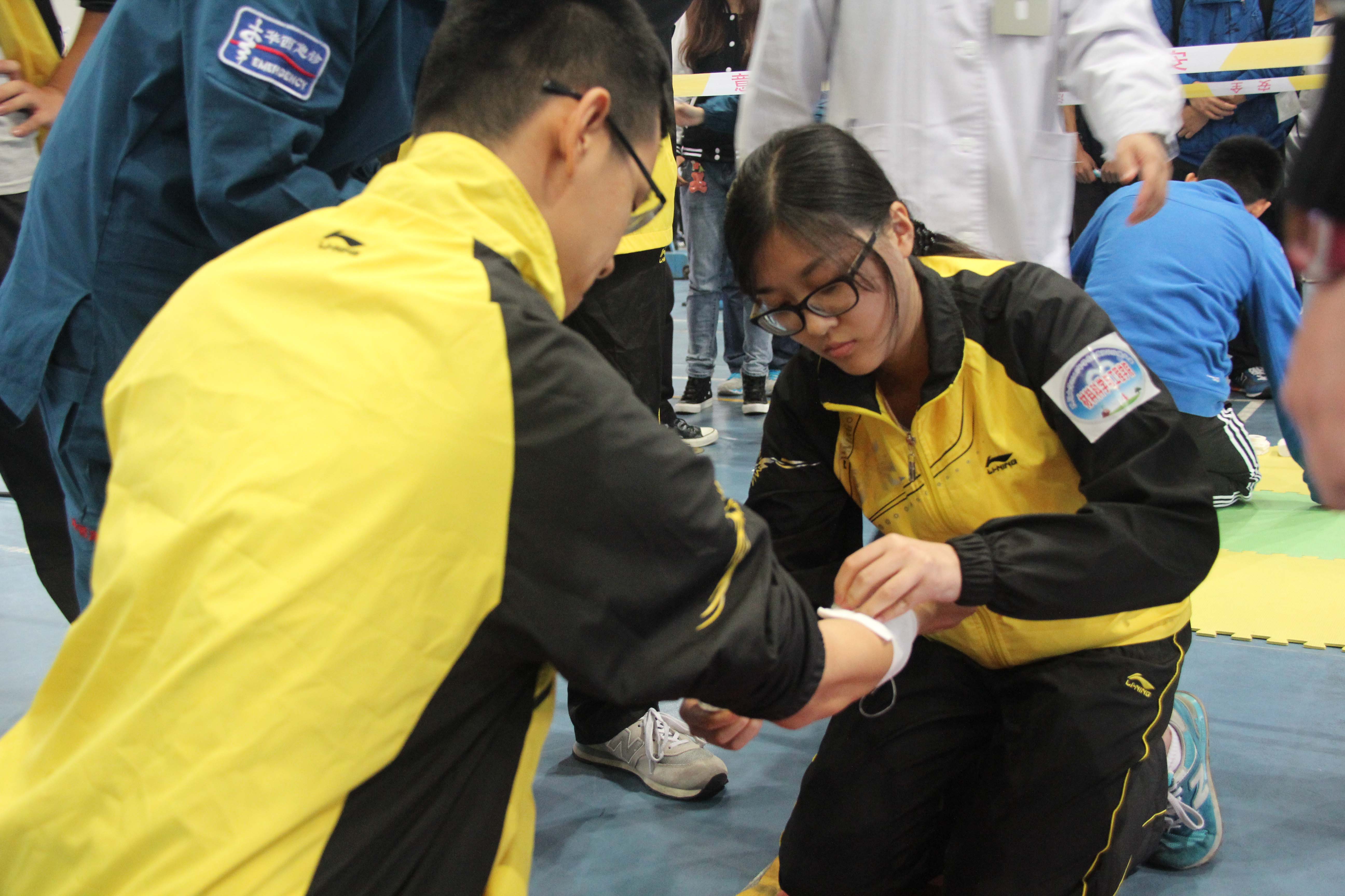 比赛开始后,由文铭老师和taptap点点官方网站的7名学生组成的参赛队伍,依次进行心肺复苏、包扎止血和夹板固定、徒手搬运三个环节。经过赛前的精心学习和准备,面对评委们关注的目光,taptap点点官方网站参赛队以熟练细致的急救手法,有条不紊地完成了全部比赛环节。