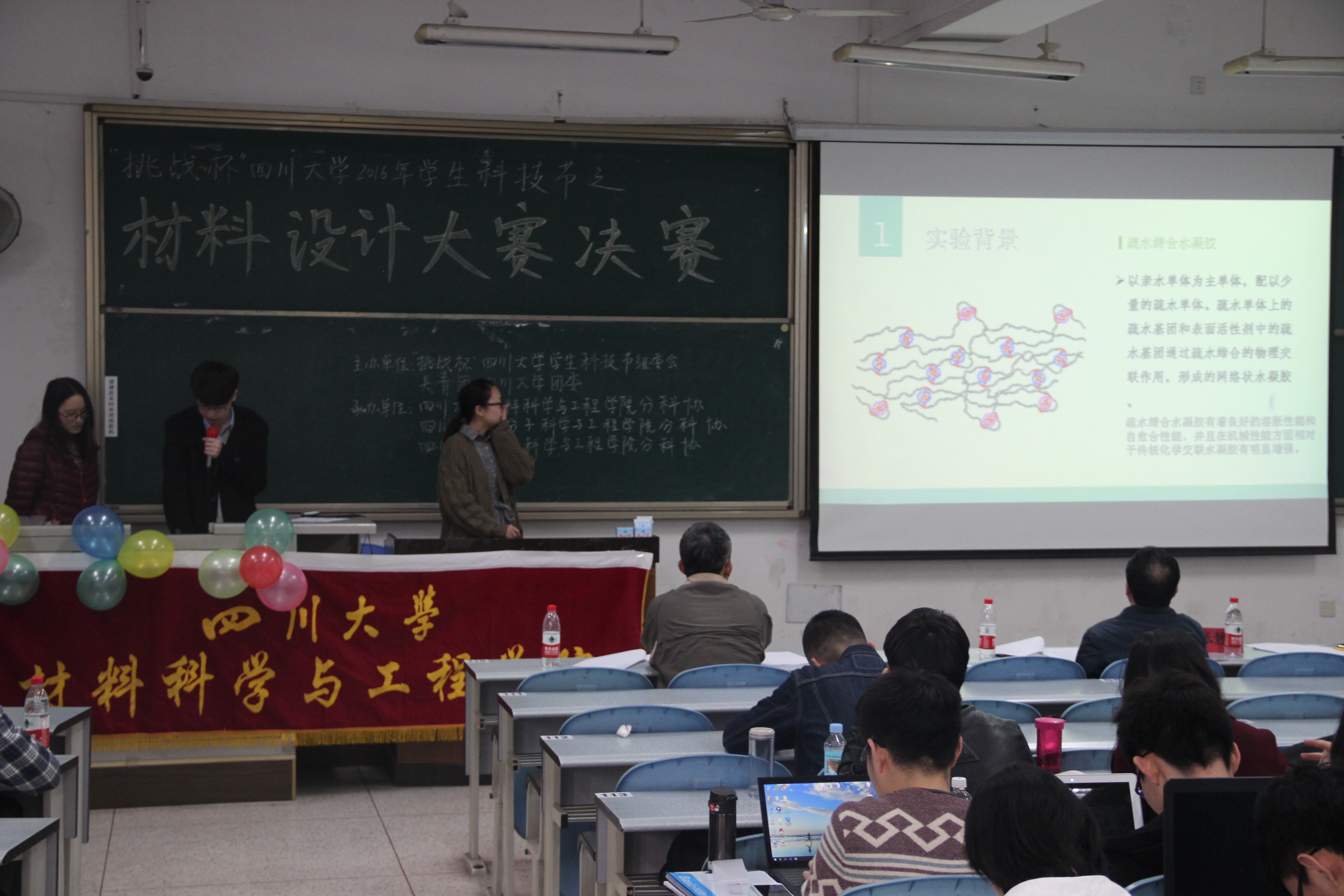 2017年3月26日,由taptap点点官方网站分团委学生学术科技协会,高分子科学与工程学院分团委学生学术科技协会和制造科学的工程学院分团委学生学术科技协会三个部门联合承办的“挑战杯”——taptap点点官方网站2016学生科技节之材料设计大赛决赛在江安校区综合楼C座307教室顺利举行。大赛评委有taptap点点官方网站党委书记朱建国教授,副院长孙小松教授,无机生医系主任芶立教授,新能源材料系主任陈云贵教授,材料科学系主任张静全教授,taptap点点官方网站党委副书记唐世红老师与院分团委书记王娇老师也出席了本次大赛。taptap点点官方网站院长尹光福教授虽然未到场,但是也表示了对本次大赛顺利举行的祝愿。