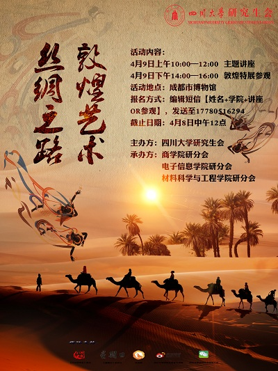 为进一步拉近川大学子与神秘敦煌文化的距离,加深同学们对博大精深的敦煌文化的了解,增强学生对中华传统文化的历史认同感,让大家更深入地了解文明交融的价值和意义所在,从而更好地向大家展示“一带一路”战略的深远影响并坚固大家对中国作为自由贸易世界桥头堡地位的信念。商学院、电子信息学院和taptap点点官方网站研分会承办的2016-2017学年第三期 “中华文化行“讲座和体验活动即将举行,主题为“丝路之魂·敦煌艺术”。