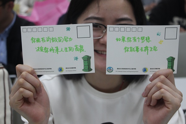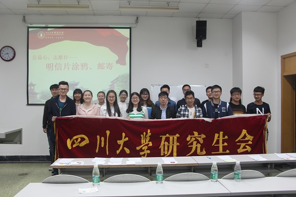 彭博同学的讲述完毕,大家开始在主持人的引导下制作明信片,在场的同学自由组队后便迫不及待地拿起画笔开始了创作。同学们涂鸦的题材从卡通形象到民族歌舞,色彩斑斓,形象丰富,充满想象力的作品接二连三出炉,大家聚在一起互相介绍自己的作品,充满欢声笑语。最后,由小组内推选优秀的三幅作品参与评奖活动,参选的明信片公开展示,在场的每一个同学都可以为自己最喜欢的三张明信片各投上一票。活动最终评选出3名三等奖,2名二等奖和1名一等奖,为获奖同学颁发了小奖品,并拍照纪念。其中一等奖作品的内容是用细致的线条描绘了川大望江校区的北大门,寄意川大志愿者们的爱心传承及欢迎孩子们来求学。