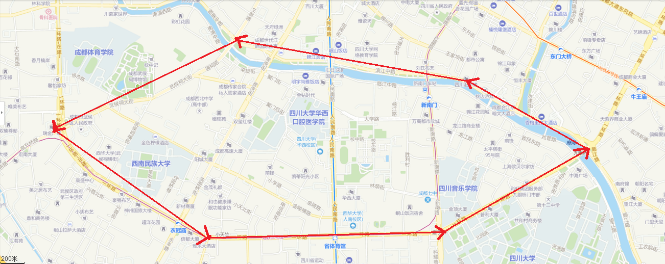 活动路线:望江校区小北门-九眼桥-锦江宾馆-武侯祠大街-西南民大-省体育馆-望江校区大北门