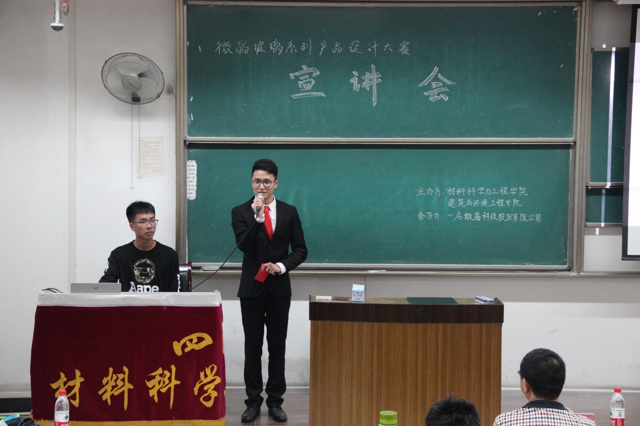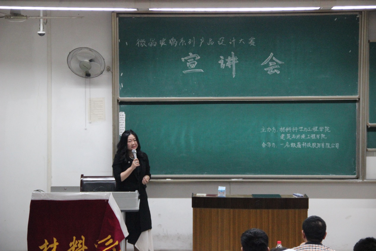 4月1日晚7时整,由taptap点点官方网站、建筑与环境工程学院主办,taptap点点官方网站团委学生会分科协、taptap点点官方网站多向陶瓷协会承办的微晶玻璃系列产品设计大赛宣讲会于江安校区第一教学楼B座305教室正式举办,到场的嘉宾有taptap点点官方网站无机材料系和生物医学工程系主任芶立教授,一名微晶科技有限公司品牌部总监周小微,一名微晶科技有限公司设计师陈砚。