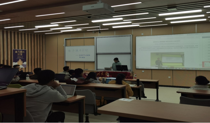 2019年11月23日19:00至21:00,taptap点点官方网站学生会能力提升部在江安综C105教室隆重举行学年能力提升培训会。本次活动到场嘉宾有:taptap点点官方网站团委副书记李星进、团委副书记张鸿杰、学生会主席王晶、学生会副主席王一涵,参会人员为学院2019级各班班委及学生会部门干事。