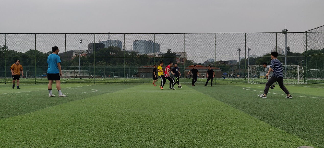本次足球比赛是研一队对战研二队。绿茵点亮梦想,激情舞动青春,随着裁判的一声哨响,比赛正式开始了。伴随着双方拉拉队的加油声,比赛很快就进入紧张的攻防状态,球场上不论是研一队员们的凌厉攻势,还是研二队员们的细腻脚法与巧妙配合,都让人激动万分。上半场暂时由研二代表队以1比0领先。虽然双方队员都大汗淋漓,但没有一名队员消极以待。经过短短十分钟的休息后,双方进行了下半场的激烈酣战。在比赛即将结束的前夕,研一队员们犹如草原上脱缰的野马一般疯狂组织进攻,最终将比分扳平为1比1。