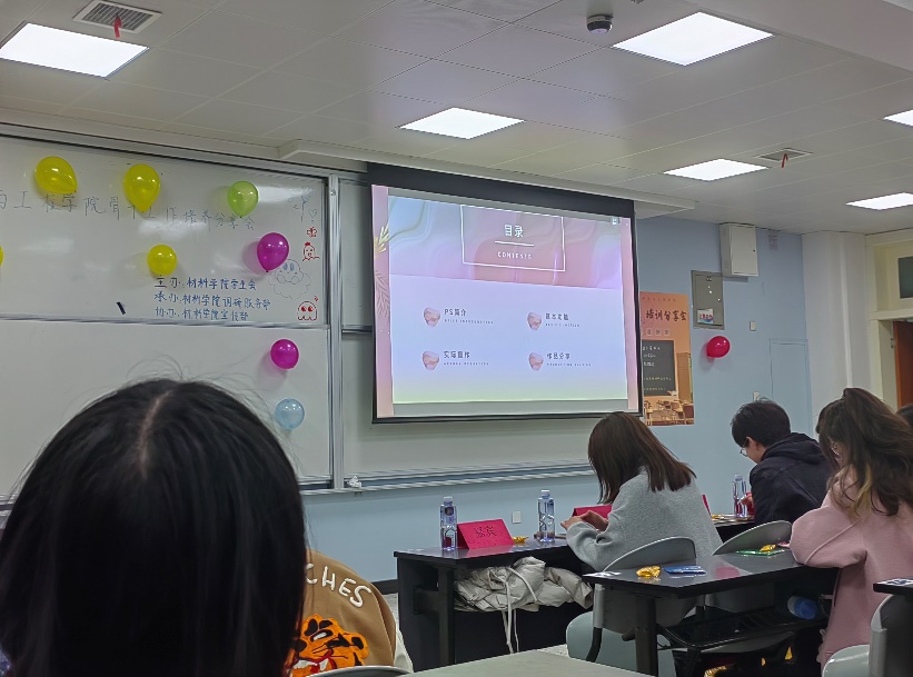 然后,由宣传部副部长赵欣仪以视频的方式对PS进行了介绍。从简介入手并着重介绍了PS的重要功能和细节的操作,并且演示了如何制作一张简单的海报,提升了干事们的海报制作能力。