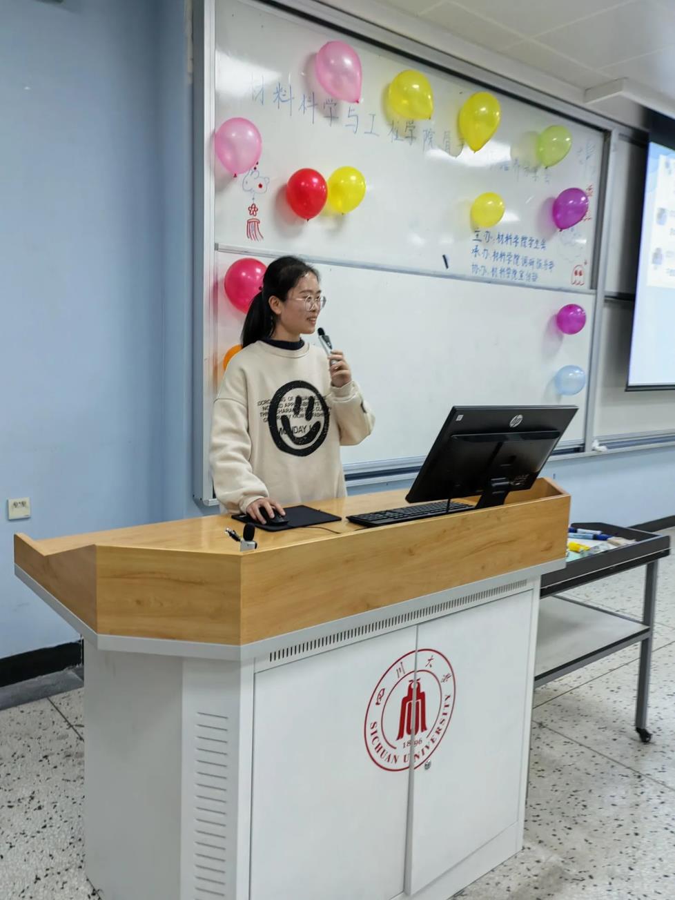 活动中场,为了活跃气氛,现场进行了猜歌名小游戏。同学们积极参与,脸上洋溢着笑容,现场一片欢愉,教室里弥漫着欢快的气氛。